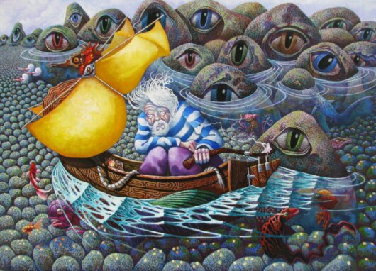 Die Komposition von „Styx“ wird von der Figur eines älteren Mannes dominiert, der in einem Boot sitzt und durch die tückischen